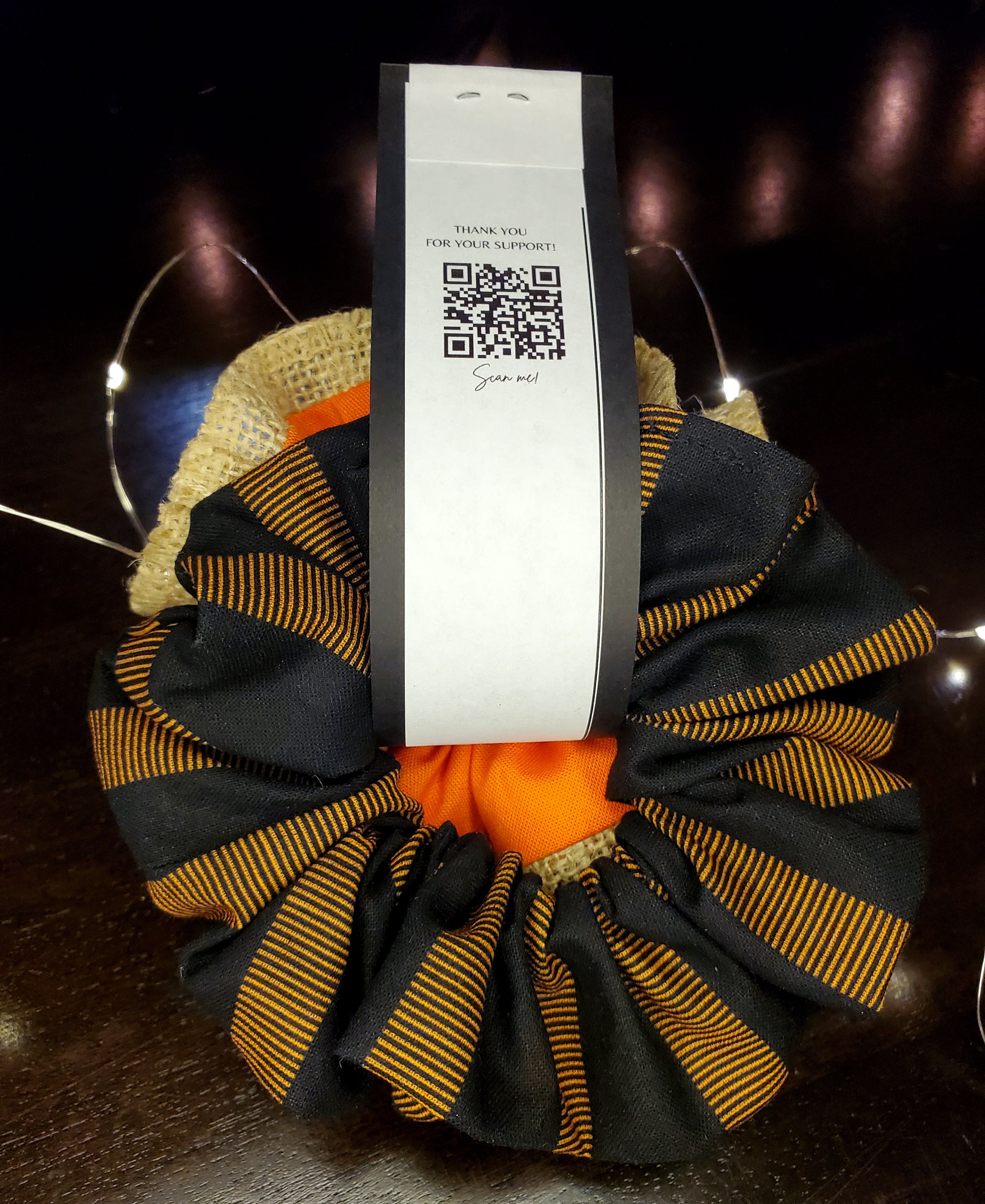 An orange scrunchie trimmed with soft burlap, inspired by Sam’s cozy, creepy onesie