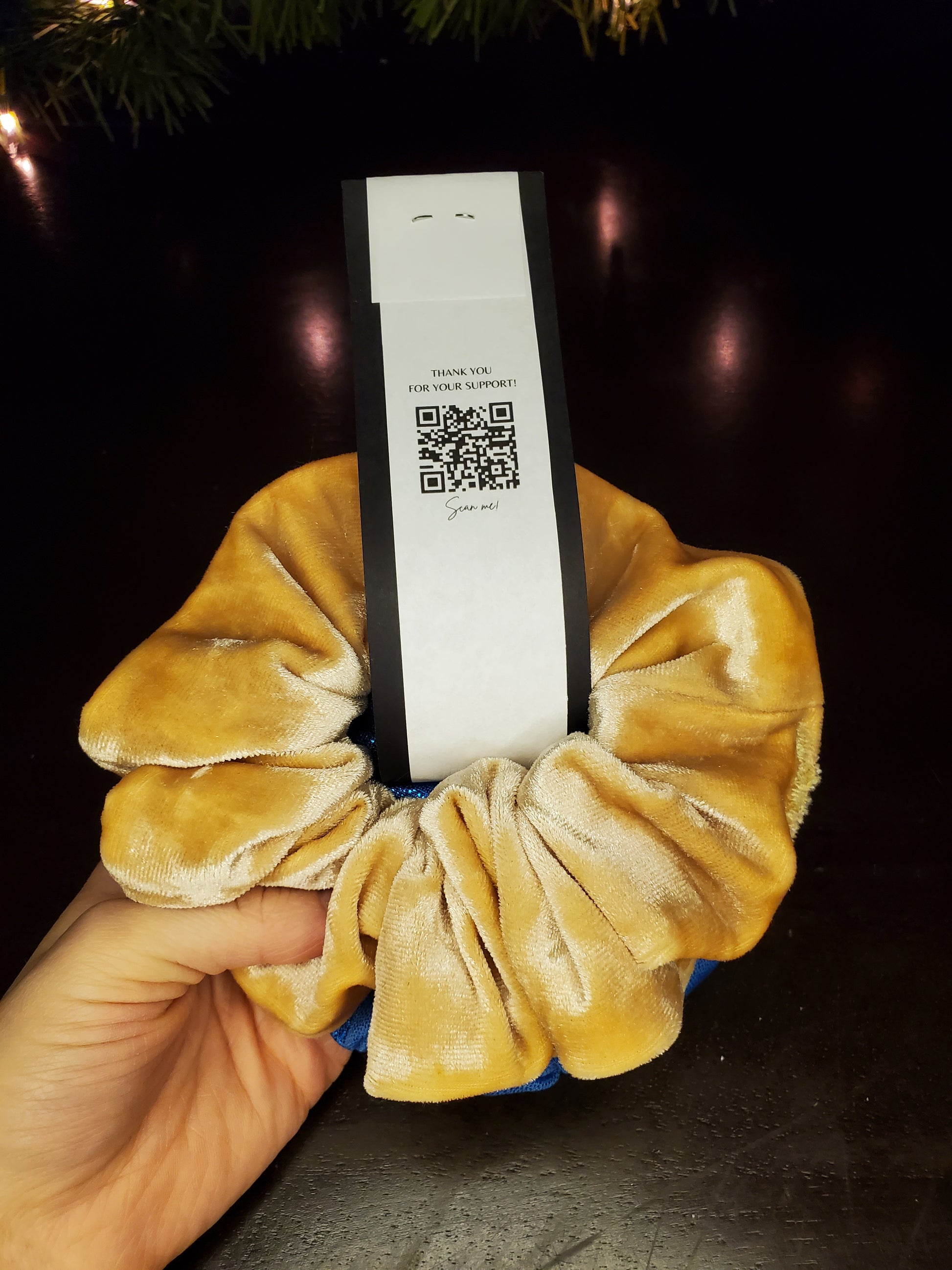 This pair features a shiny blue mystique scrunchie and a soft brown velvet scrunchie.