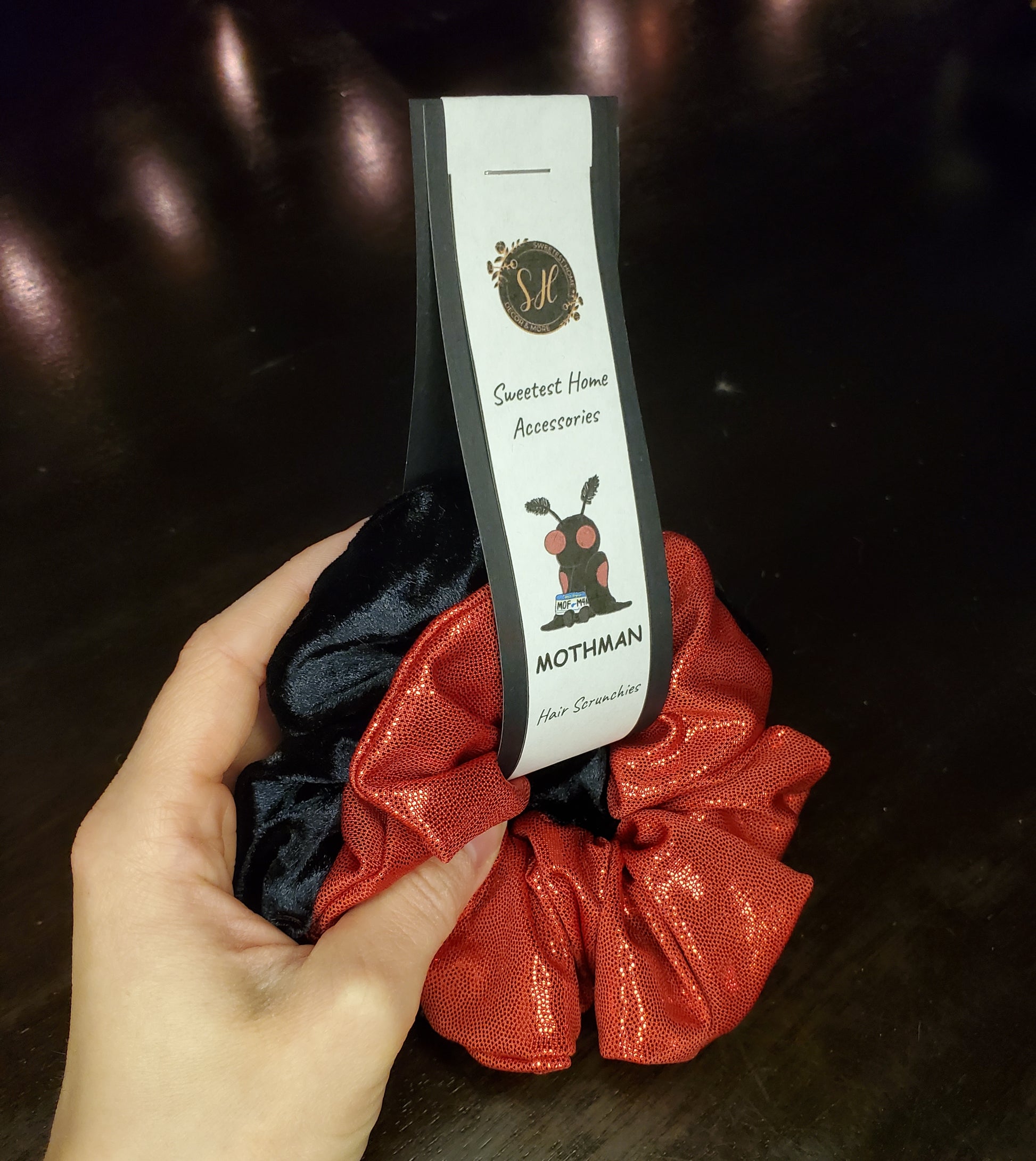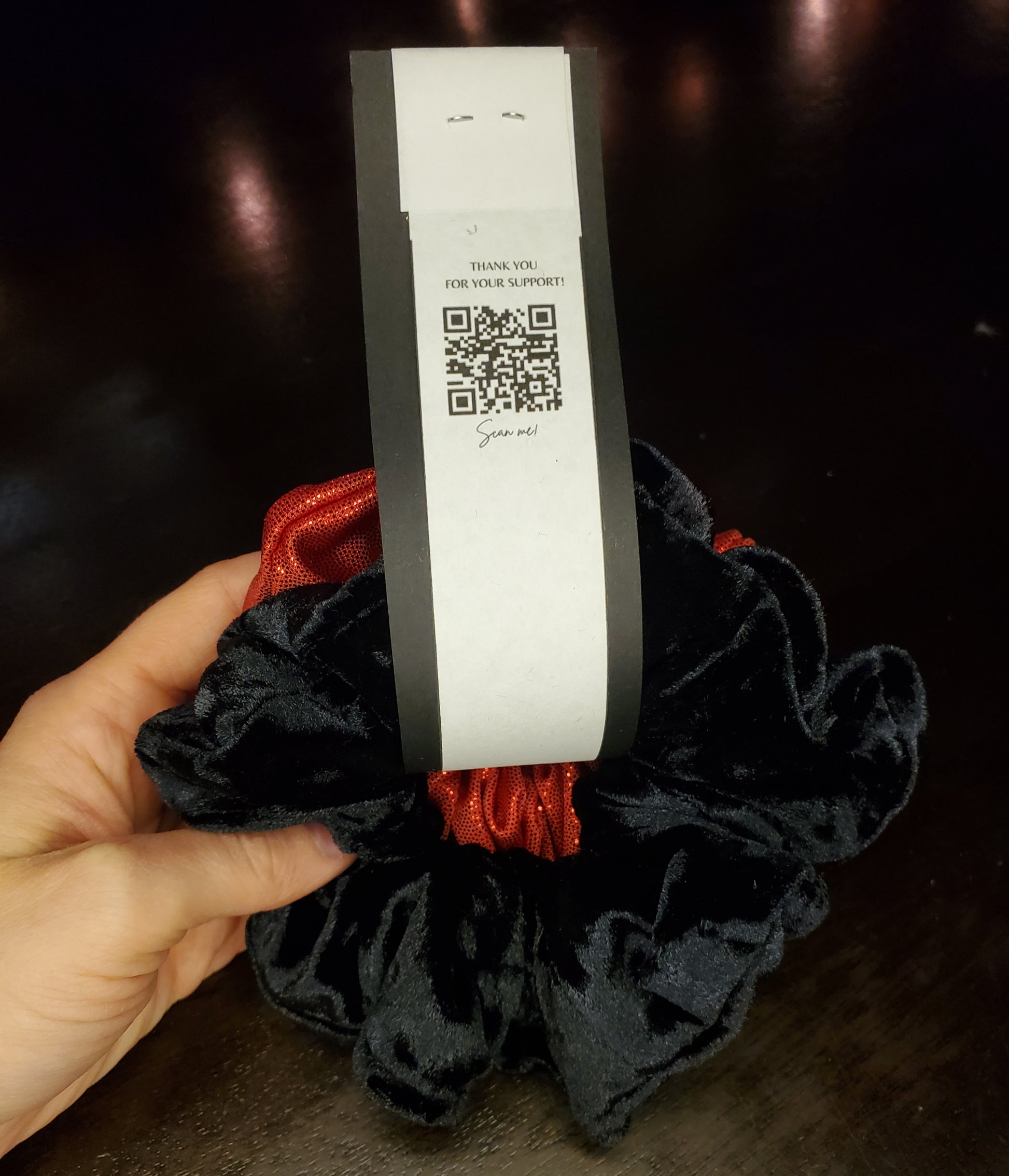 If you see glowing red, don't worry, it's just your new scrunchie! This pack features a glowing red knit scrunchie and a soft, black velvet scrunchie.