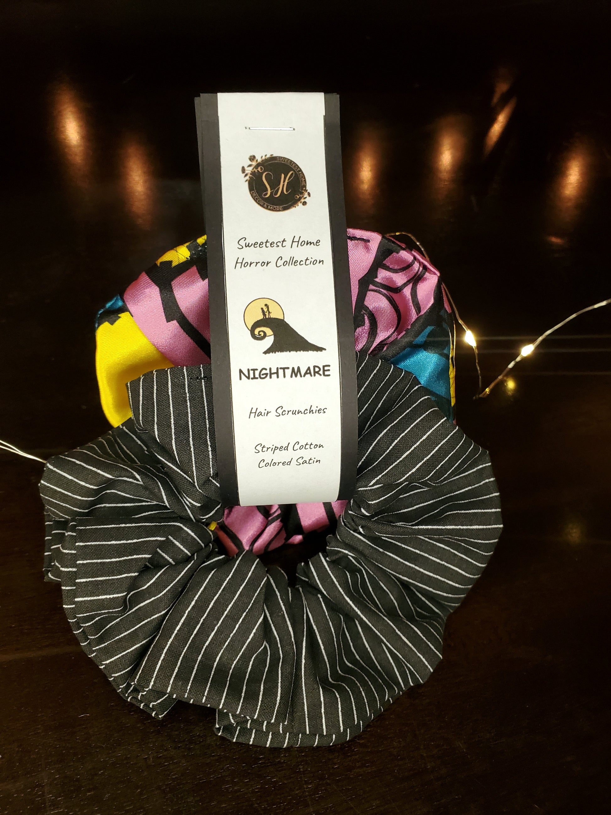 Whether you're planning your next costume party or just love a little fright in your fashion, these scrunchies are the perfect subtle fandom accessory—recognizable only to those who truly know the tale of Jack & Sally.