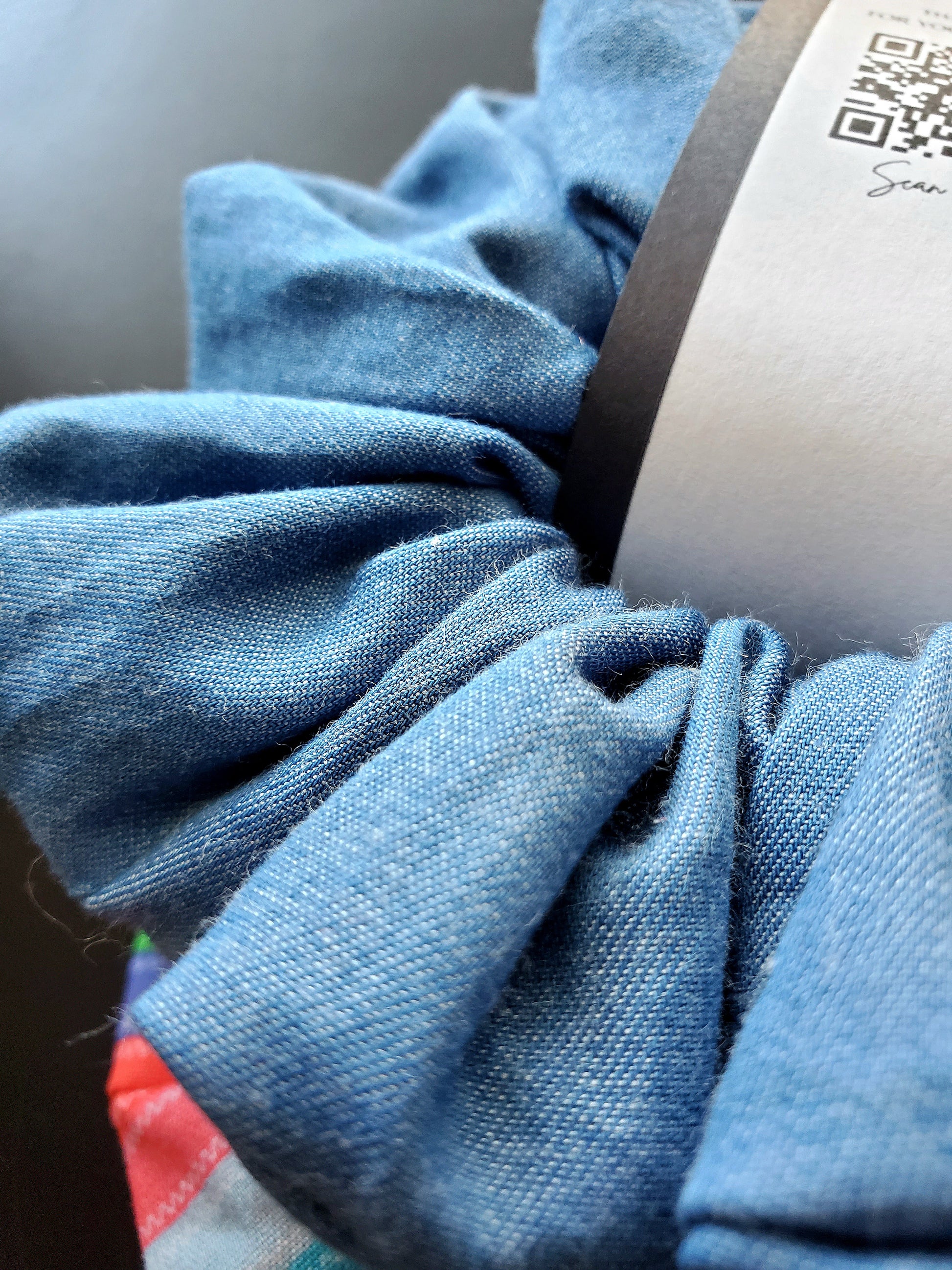 This scrunchie pack features a cotton print of his shirt and a denim scrunchie just like his overalls!
