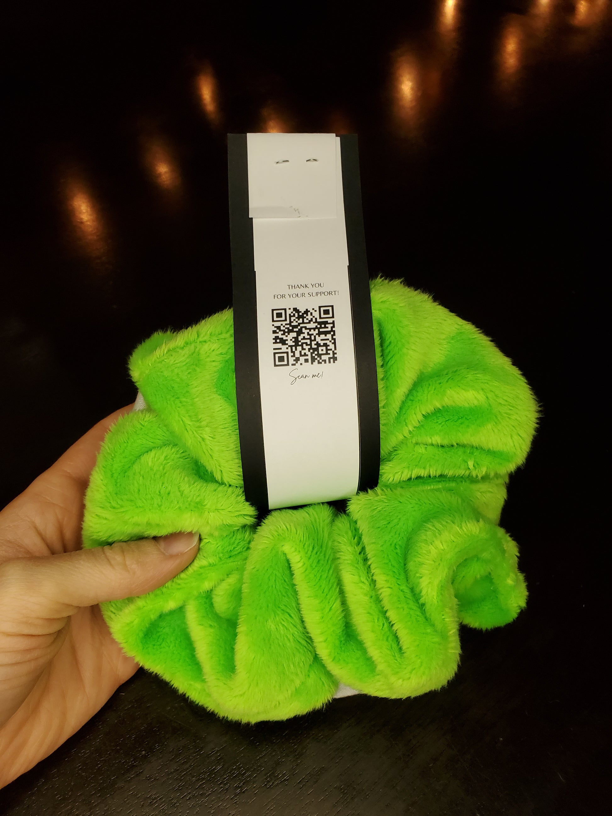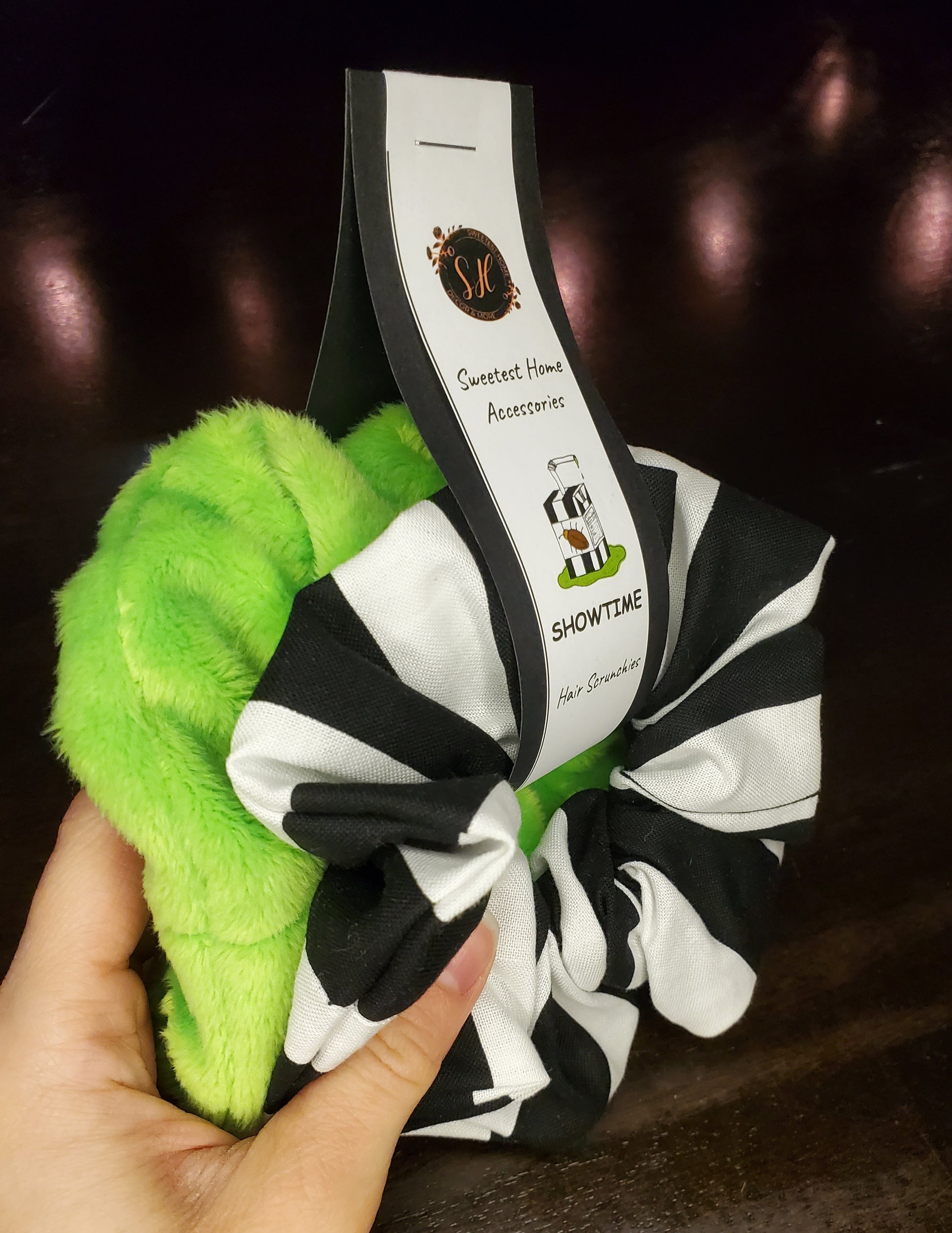 With a striped cotton scrunchie and a bright green minky scrunchie (very soft), you are sure to put on the perfect show!