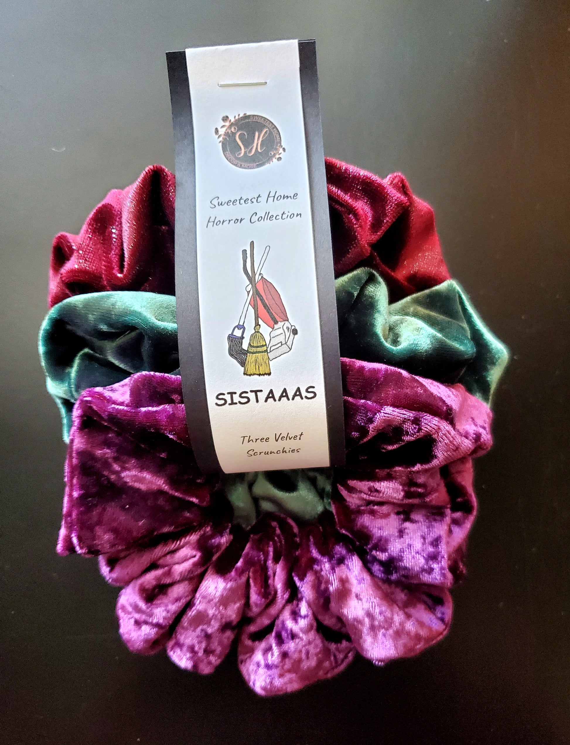 Three luxurious velvet scrunchies, one for each of your favorite witches!
