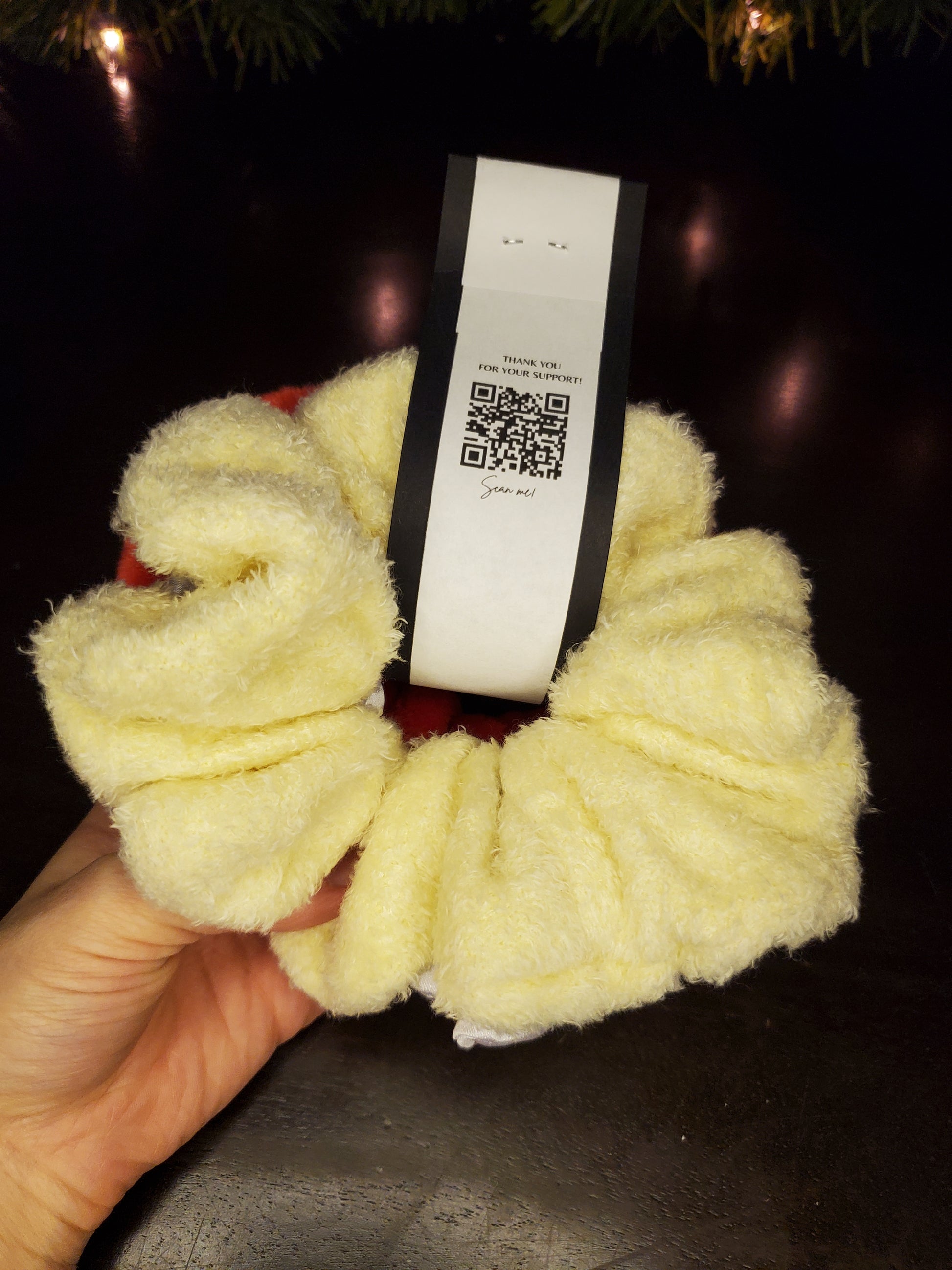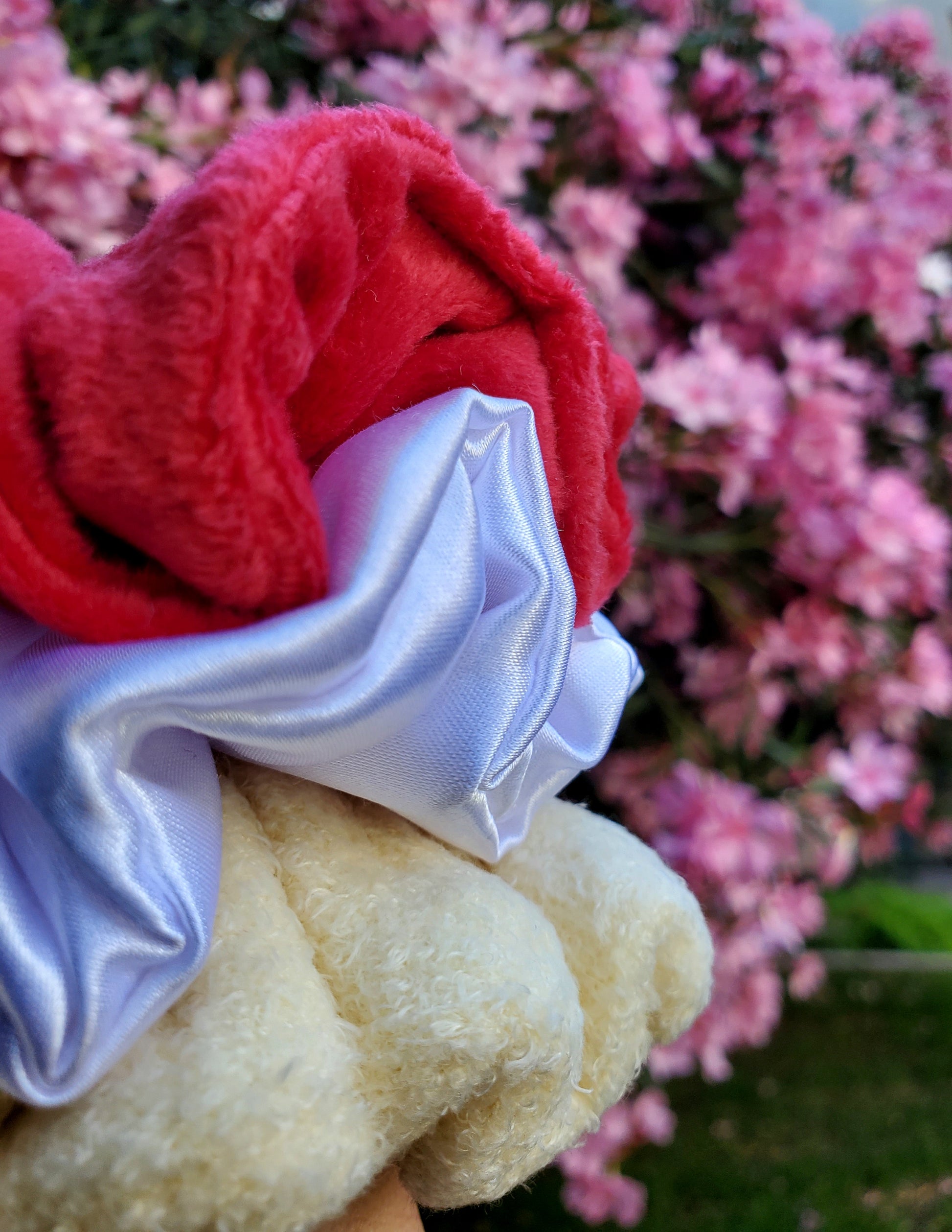 The red strawberry scrunchie is a soft and minky fabric with imprinted dots for texture. The white whipped cream scrunchie is a lovely satin. The cake scrunchie is a soft fluffy knit, much softer than it appears.